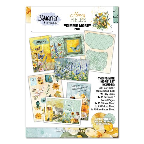 This pack includes 20 5.5' x 3.5" double sided Tuck N Play cards, 4 A5 envelope/pocket pages, 1 A5 sticker sheet, 1 A5 vellum sheet and 1 A5 rice paper sheet, all with mixed patterns on the back of the cards.